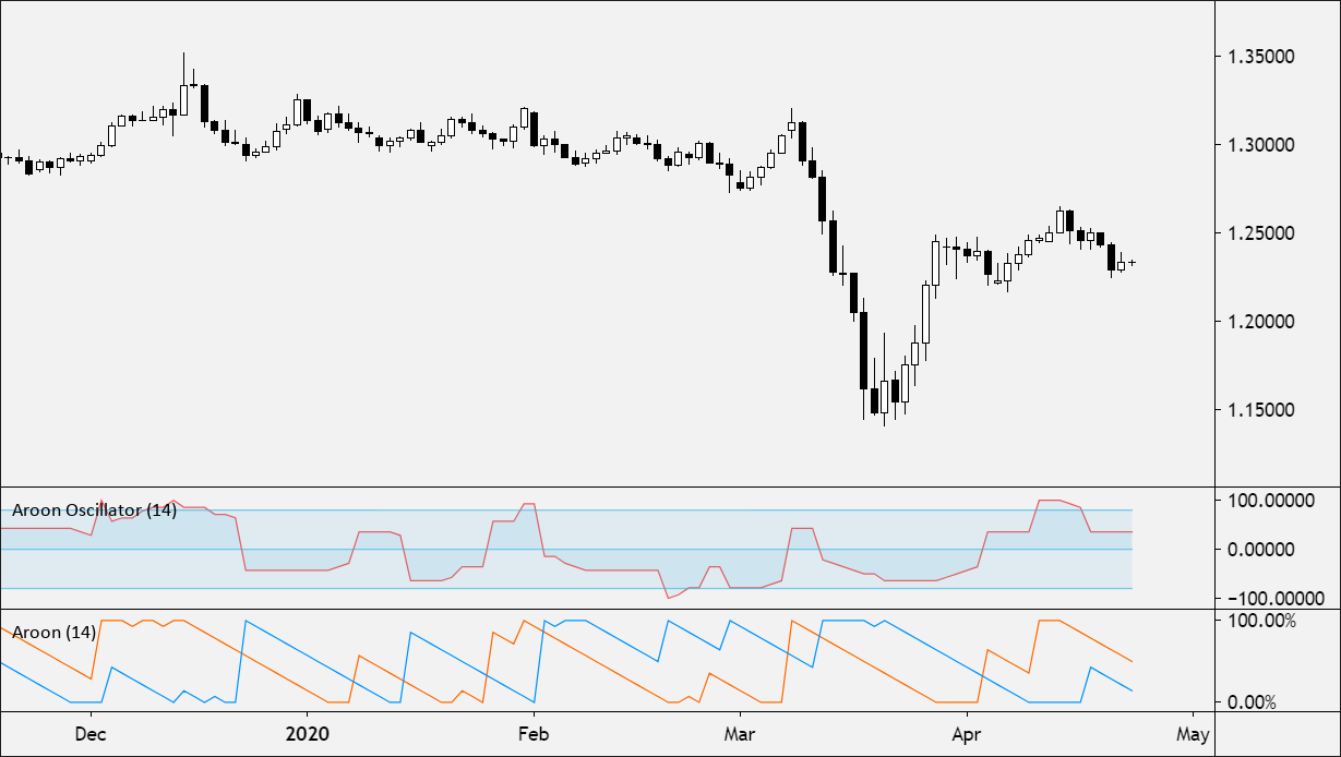 The Aroon Oscillator is a single line that is defined as the difference between Aroon(up) and Aroon(down).