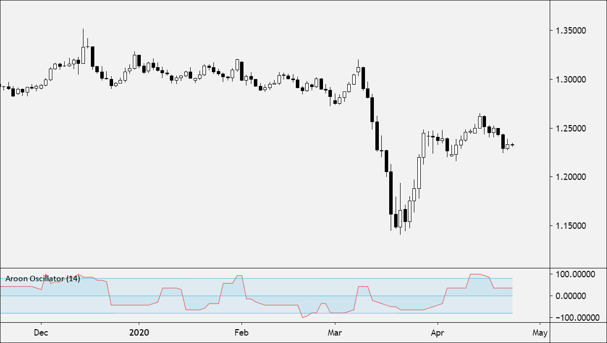 The Aroon Oscillator measures the strength of a trend and is constructed by subtracting Aroon Down from Aroon Up.