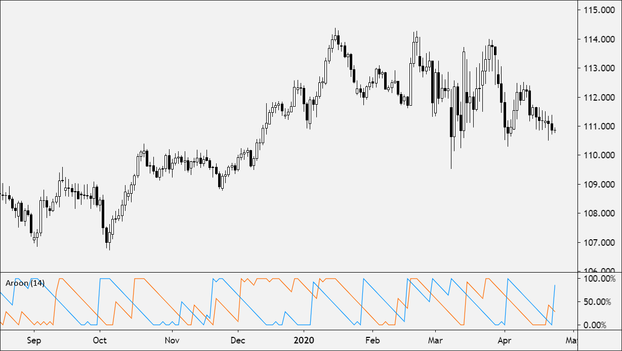The Aroon Up/Down technical indicator identifies when the price is in a trend or trading sideways.