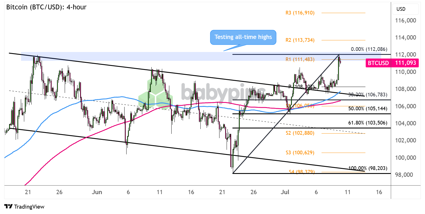 Profit-taking at R1 ($111,483) and the May 2025 highs could spur a pullback to the pivot point level ($108,302) or the 38.2% Fibonacci retracement level near the broken channel top and dynamic support at the moving averages.