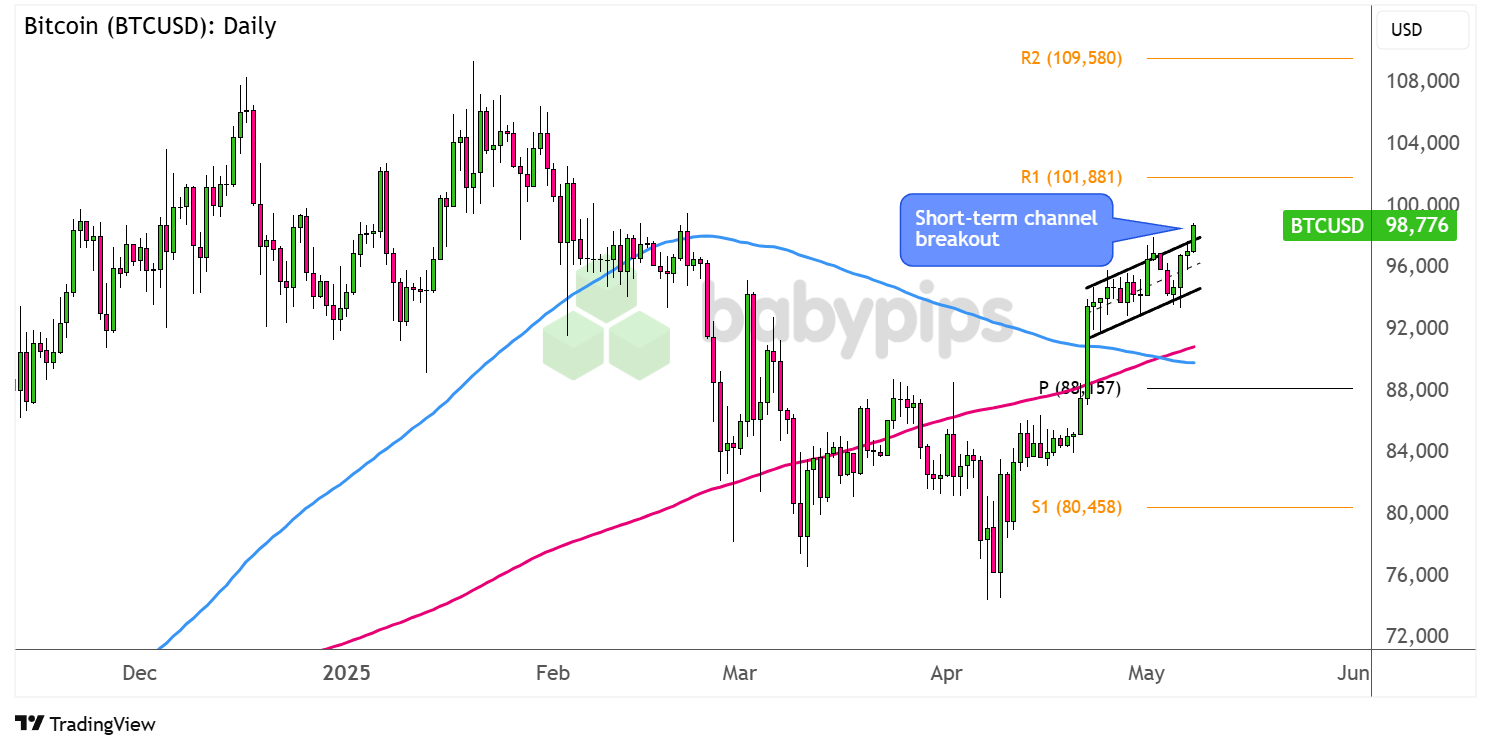 In this case, keep an eye out for potential dips within the short-term ascending channel or back down to the area of interest near the pivot point level ($88,157) if the latest rally fails to gain traction.