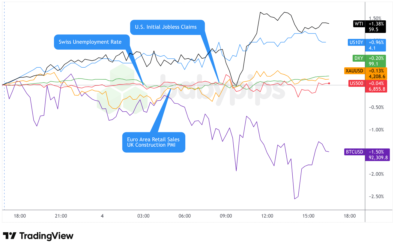 The London session saw the dollar trade mixed but arguably net lower against major currencies. The weakness correlated with disappointing European economic data—particularly the UK Construction PMI plunging to 39.4 versus 45.0 expected and Eurozone Retail Sales missing on the monthly reading—which paradoxically seemed to weigh on the dollar rather than support it. This counterintuitive move suggested that traders were either positioning for the upcoming U.S. jobless claims release or that concerns about broader global economic weakness were dominating currency flows.