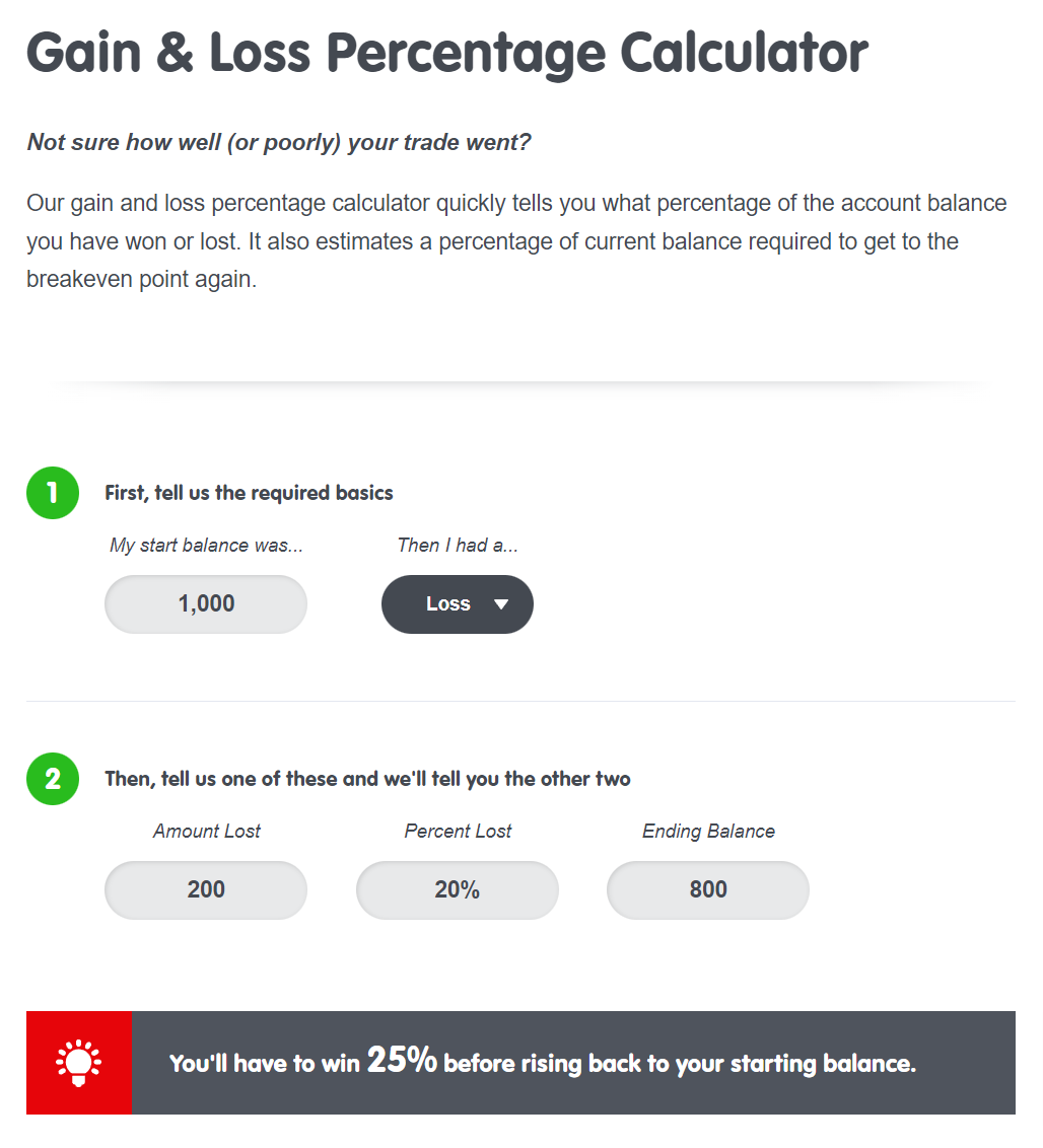 Use our Gain & Loss Percentage Calculator to help you know what percentage of the account balance you have won or lost.