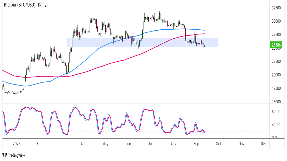 Bitcoin made a couple of failed attempts to bust through the ceiling near $32,500 recently, creating a double top pattern. Price is now down to the neckline at $25,500, and a break below support could confirm the reversal.