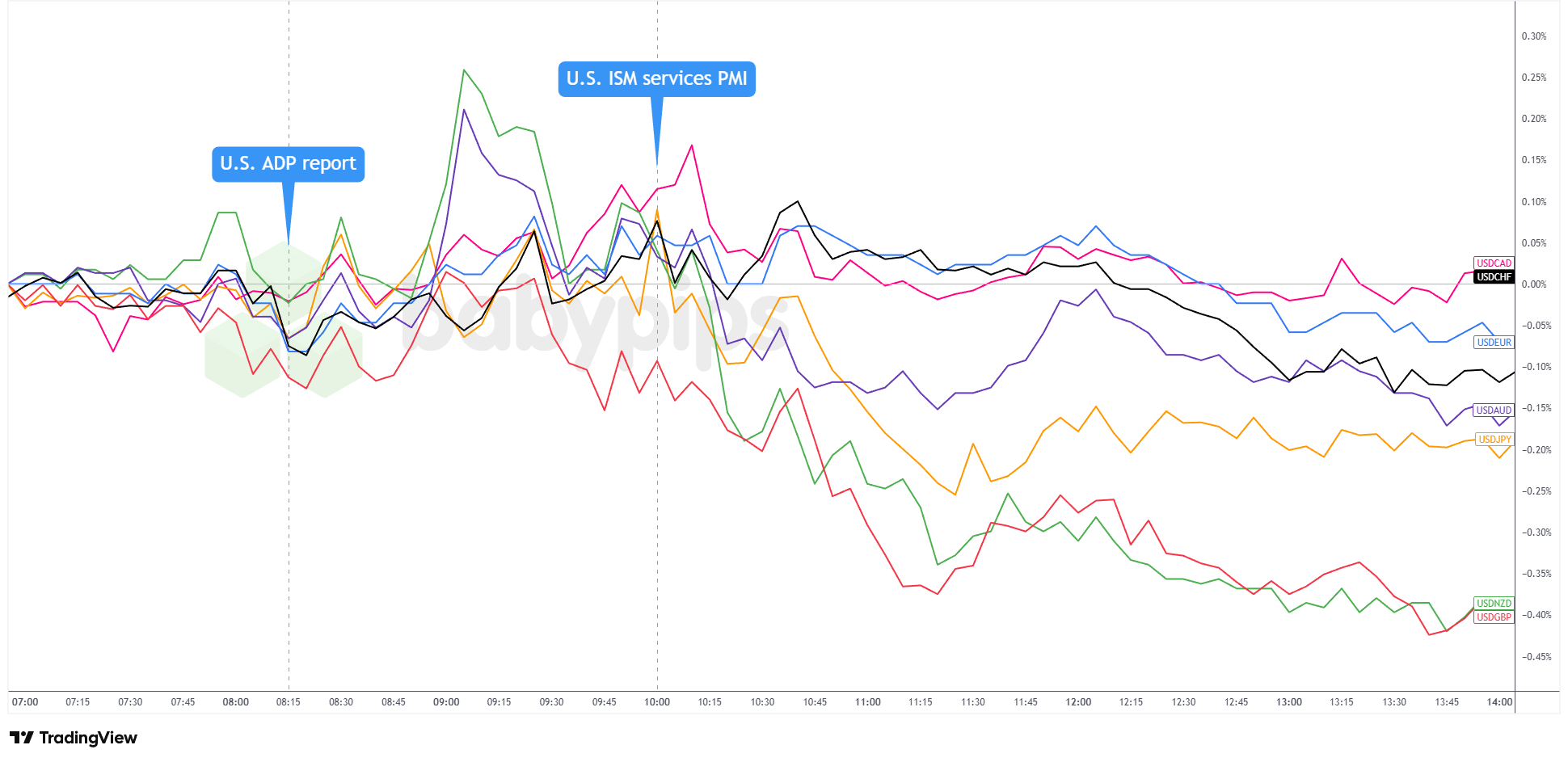 When ADP confirmed a 32,000 job drop instead of a 15,000 gain, the dollar slipped further but briefly bounced. The quick move appeared to be profit-taking as the U.S. session opened, with traders waiting for the ISM Services report.The bullish pullback didn’t last. ISM Services printed at 52.6, slightly above expectations, but markets barely reacted. Traders seemed far more convinced that labor market softness carried more weight, so they discounted the mixed signals from services. By the close, the dollar index was down about 0.45%, its weakest single day since September.