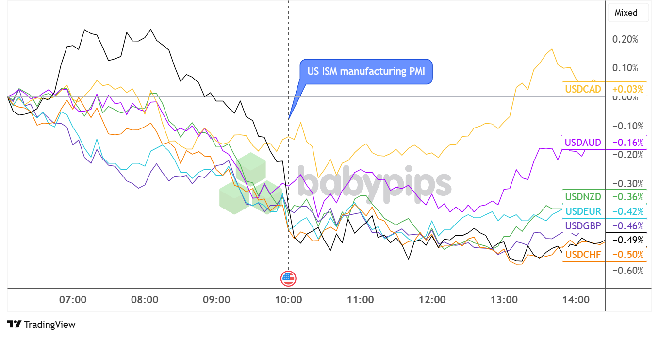 The U.S. dollar, which was already edging lower leading up to the ISM PMI release, weakened further against most major currencies following the release of the disappointing manufacturing data.