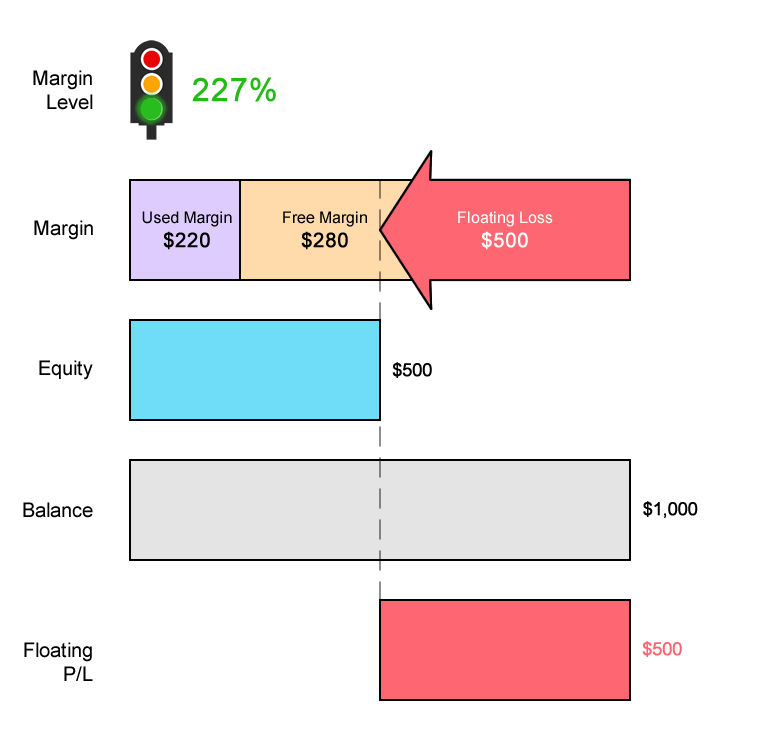 Margin Level = (Equity / Used Margin) x 100% 227% = ($500 / $220) x 100%