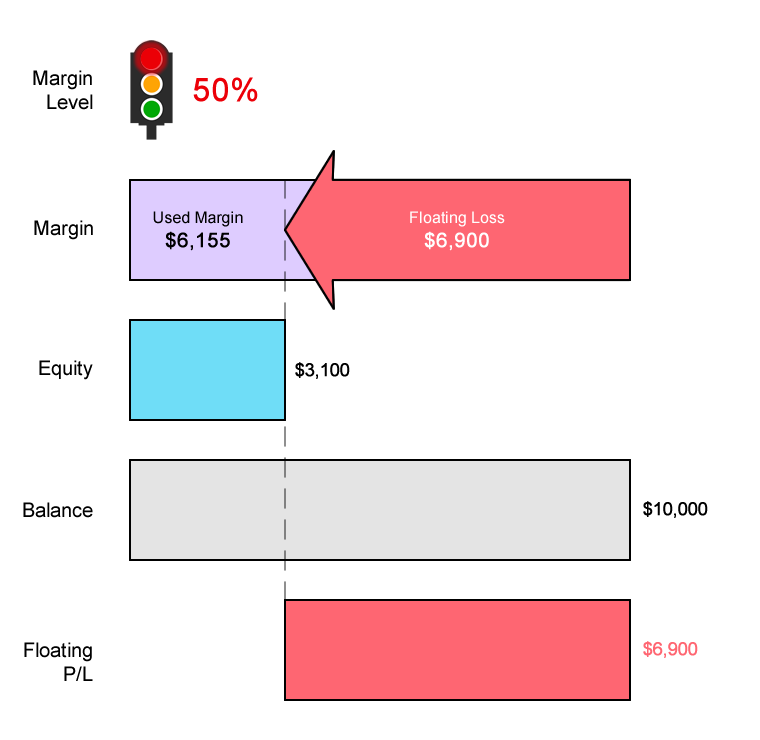 Margin Level = (Equity / Used Margin) x 100% 50% = ($3,100 / $6,155) x 100%