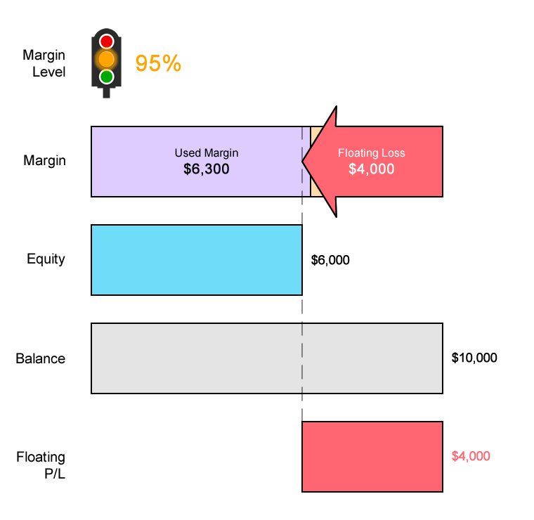 Margin Level = (Equity / Used Margin) x 100% 95% = ($6,000 / $6,300) x 100%