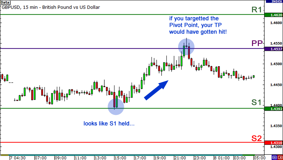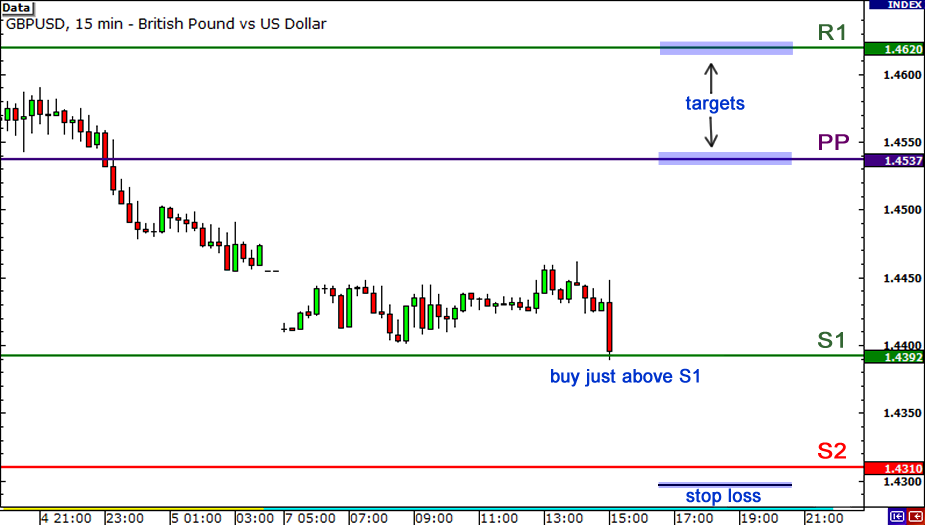 Let’s take a look at an example so you can visualize this. Here’s a 15-minute chart of GBP/USD.In the chart above, you see that price is testing the S1 support level. If you think it will hold, what you can do is buy at the market and then put a stop loss order past the next support level.