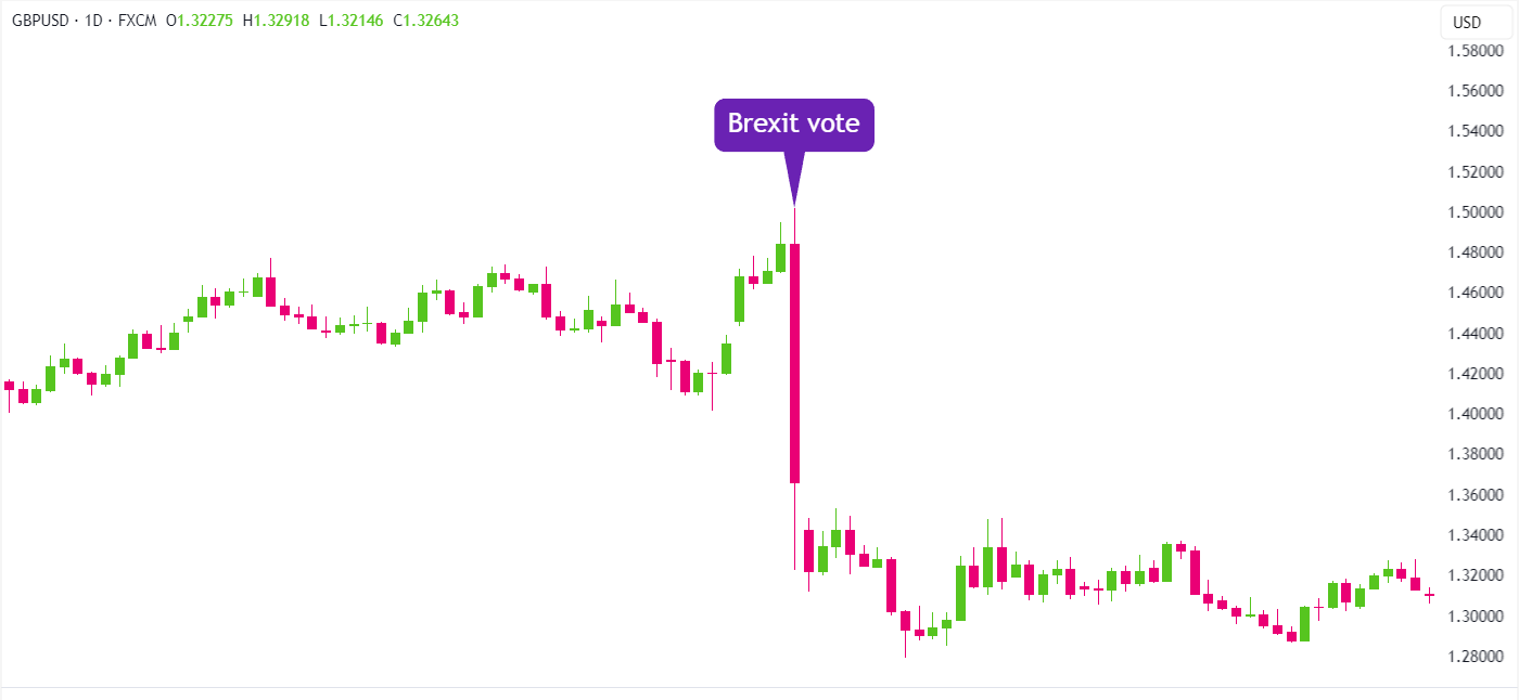 When the Leave outcome materialized, GBP plunged about 7% overnight against major currencies, despite no immediate change in interest rates.