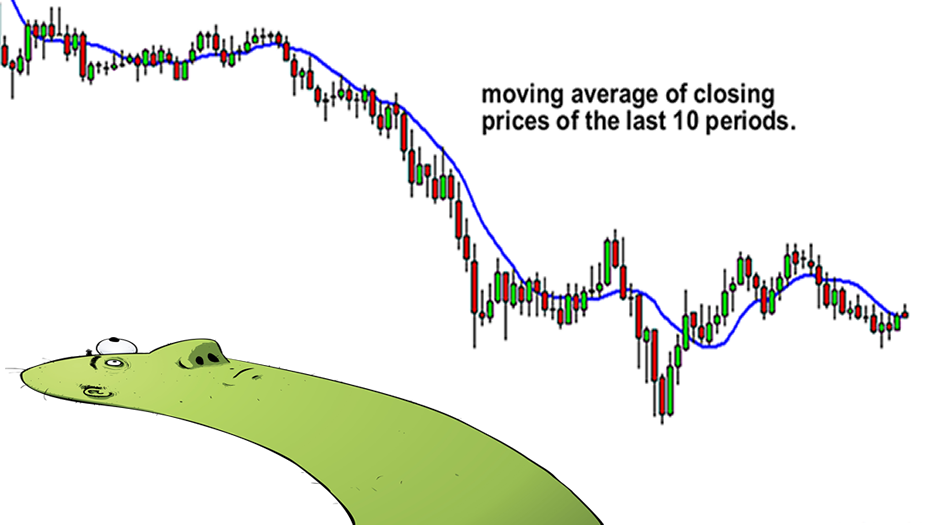 On a chart, it would look like this:As you can see, the moving average looks like a squiggly line overlayed on top of the price (represented by Japanese candlesticks).