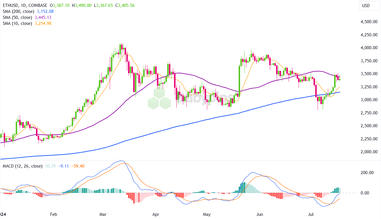 The chart displays the price action of ether (ETH) against the US Dollar (USD) on the Coinbase exchange from the start of 2024 until July 18, 2024.
