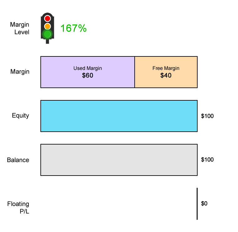 Margin Level = (Equity / Used Margin) x 100% 167% = ($100 / 60) x 100%
