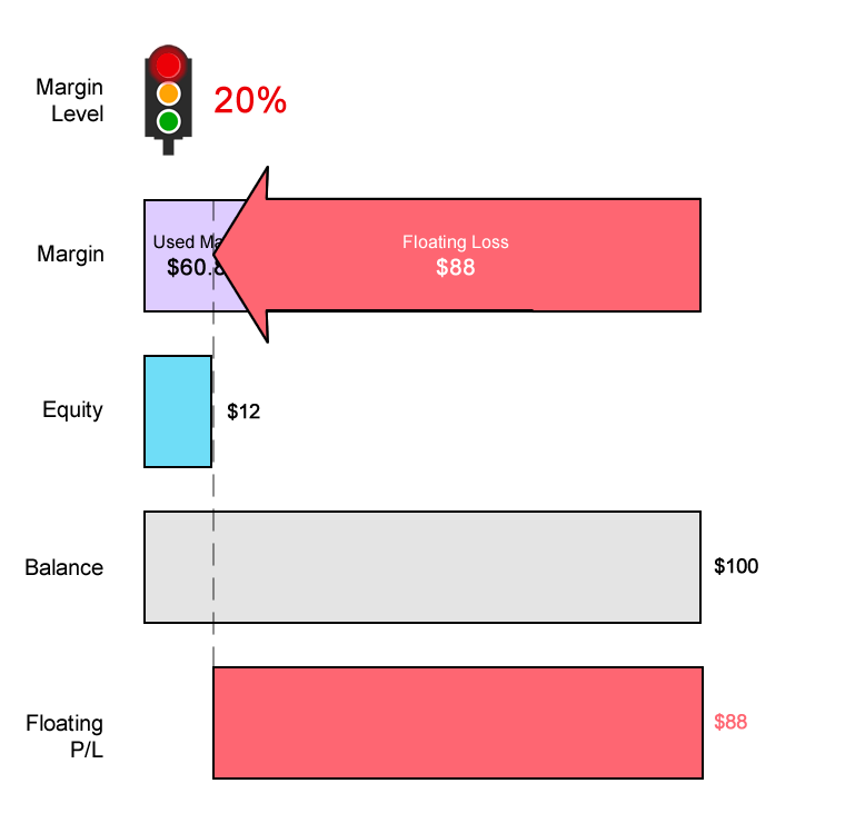 Margin Level = (Equity / Used Margin) x 100% 20% = ($12 / $60.88) x 100%