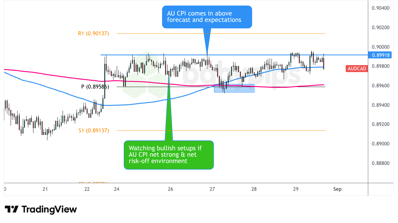 Still, this pair performed moderately well with the bullish AU catalyst, though not as cleanly as AUD/USD. The ascending triangle pattern held initially, with AUD/CAD finding support near the 0.8960 pivot point after the CPI release as predicted.