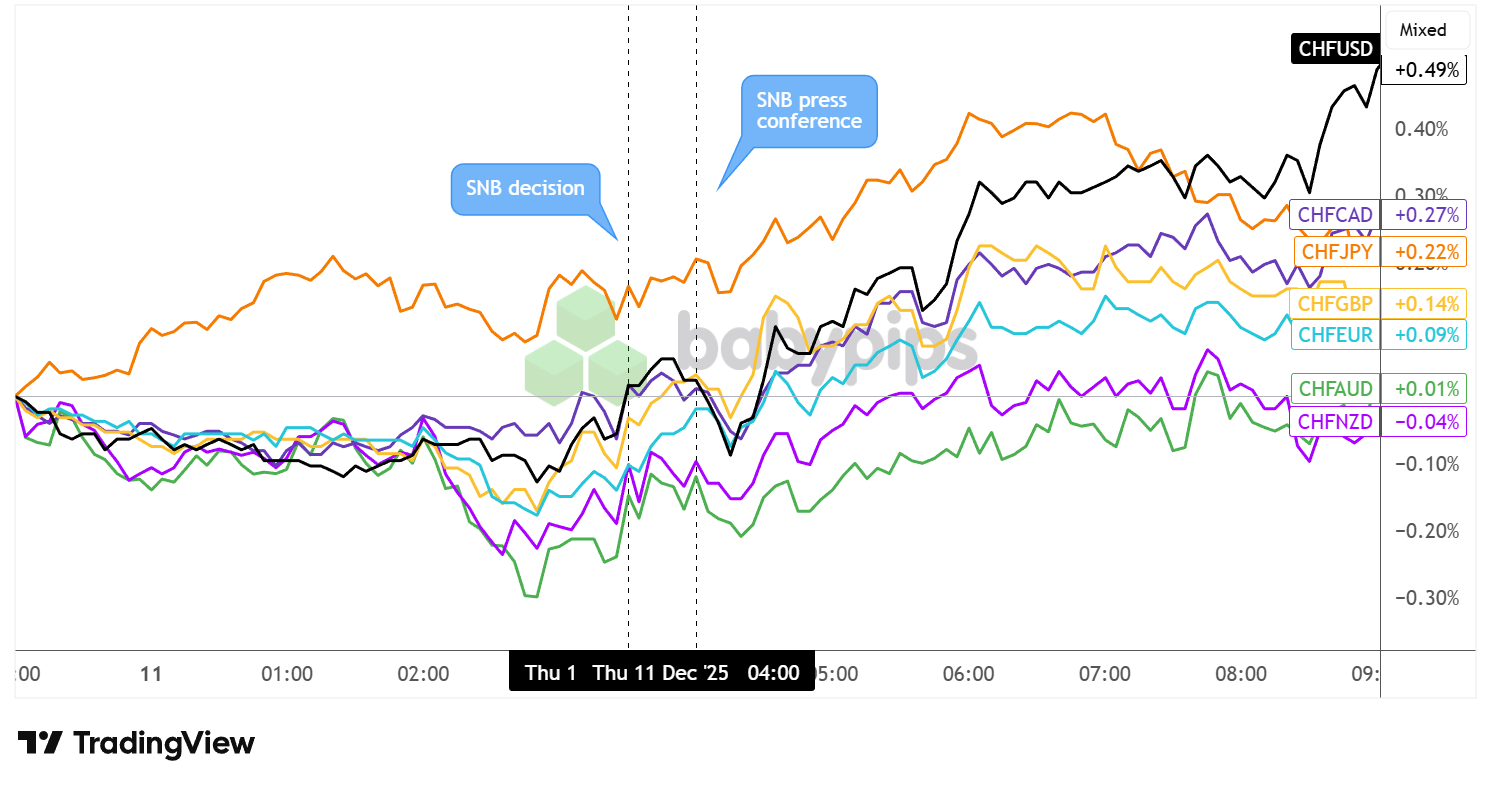 CHF briefly pulled back during the press conference, as traders likely weighed the implications of avoiding further easing amid a weaker inflation outlook, while also assessing the central bank’s willingness to intervene in the currency market “as necessary.”