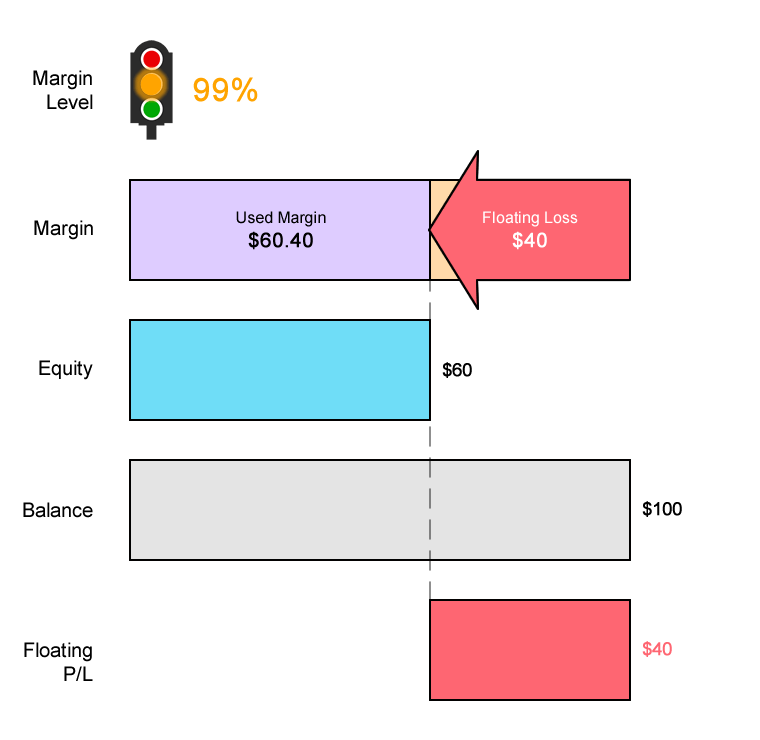 Margin Level = (Equity / Used Margin) x 100% 99% = ($60/ $60.40) x 100%