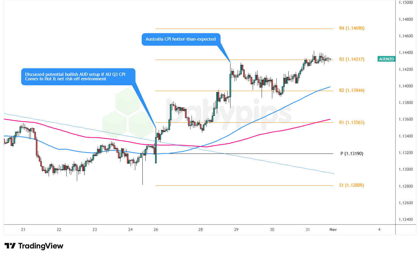 The hotter-than-expected CPI print sparked an immediate validation of fundamental Aussie long bias, confirmed by AUD/NZD’s move to break above R2 immediately. After a quick consolidation & pullback, the pair retested the R2 Pivot Point resistance-turned-support before climbing to new weekly highs as the fundamental sentiment favored Aussie over the Kiwi.